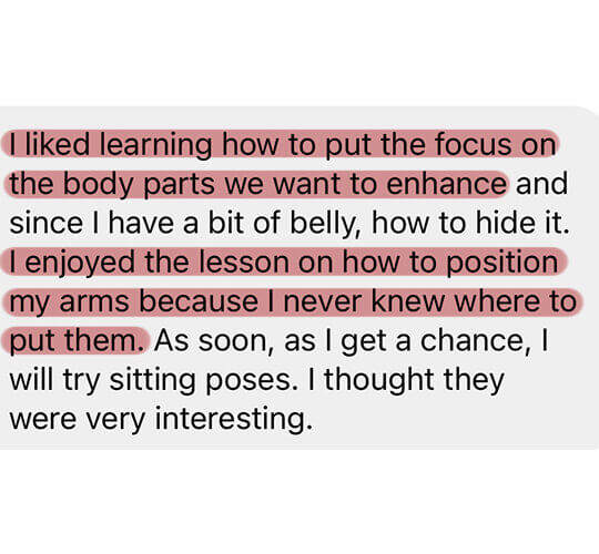No matter your body type, once you dive into our classes and start practicing each technique, you’ll feel more confident than ever. Your photos will show off the best version of you, giving you that extra boost to shine in every photo.