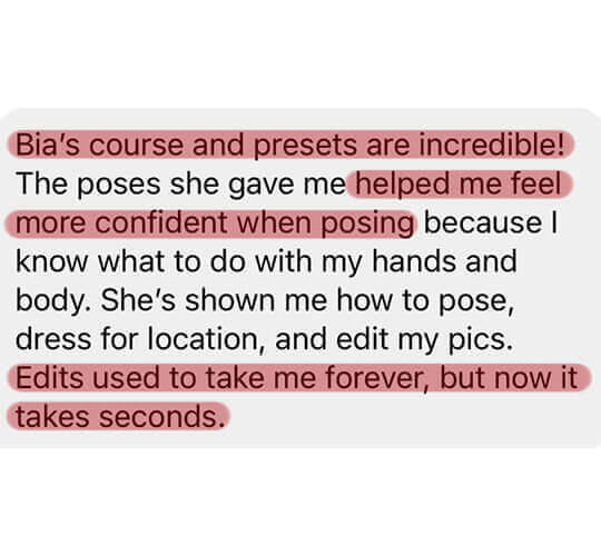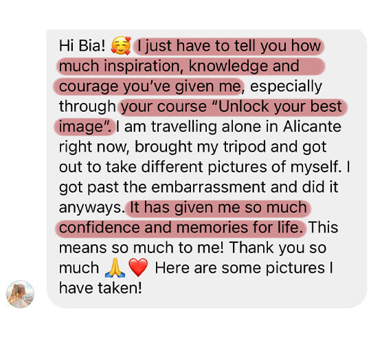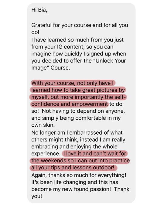 The Unlock Your Best Image course was designed for anyone who wants to take beautiful and professional photos using only their cell phone. You are going to have access to several classes and learn how to look amazing in every photo and how to capture important moments in unforgettable ways, even when you don’t have friends or family with you to take your pictures.
